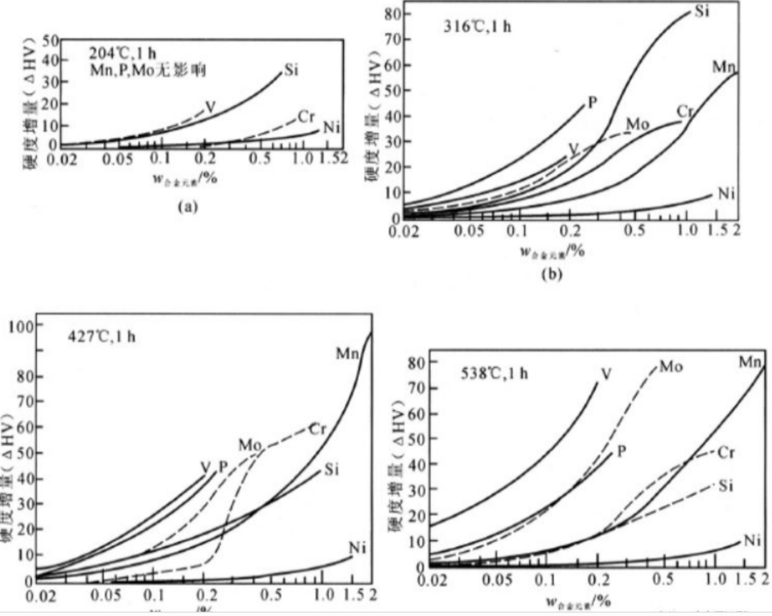 合金元素不同含量不同温度对回火性能的影响:见下图所示,测量的是WC=0.2%时不同温度,不同含量在回火时引起的硬度的变化增量。在200度左右回火时,材料内部的原子活动及组织变化非常小,合金元素的影响非常少;在316度回火时,合金元素的使用加强,当碳化物析出时,碳化物形成元素(如铬钼钒)倾向于向碳化物移动,而非碳化物形成元素(磷硫镍)倾向于向马氏体基体移动,此时硅提高的硬度最明显;在427度回火时,合金元素的作用进一步加强;在538度时,合金元素主要通过阻止碳化物长大及铁素体晶粒等轴化而延缓硬度的下降,且钼和钒的作用明显加强。