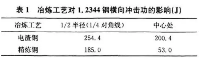 从表1中的数据可以发现,在其他生产工艺相同的条件下,电渣钢的横向冲击性能,特别是中心处的冲击功明显优于精炼钢,其中1/2半径(或1/4对角线)处横向冲击性能提高了37.51%,中心处横向冲击性能提高了278.11%。