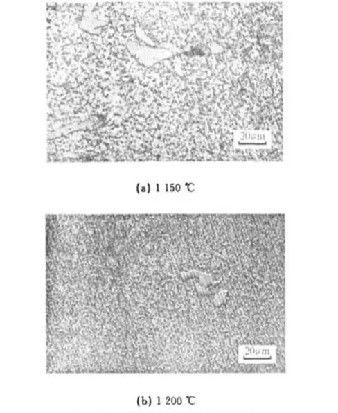 图1是1.2344钢分别在1150°C(图1a)和1200°C(图1b)下保温5h的微观组织,通过比较可以发现,当扩散温度由1150C提高到1200°C,显微组织中的大颗粒碳化物明显减少,碳化物的分布更加弥散、均匀。