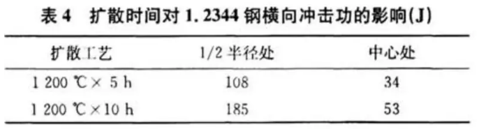 表4是对5t精炼钢锭进行不同扩散时间的试验,结果表明在相同的扩散温度下,扩散时间由5h增加到10h,可以有效增加钢材的横向冲击性能,其中1/2半径处提高了41.62%,中心处提高了35.85%。