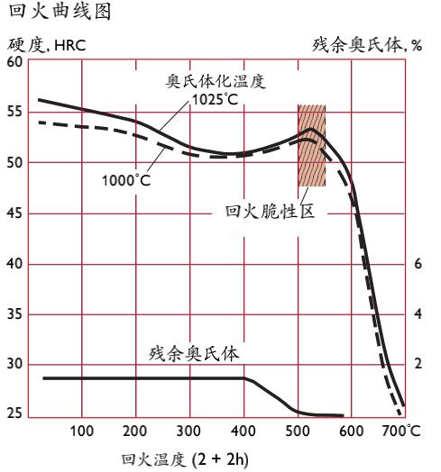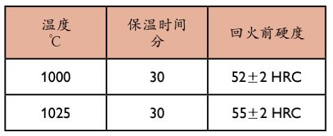 根据所需硬度参考回火曲线选择回火温度。对压铸模具至少回火三次,热锻模具和挤压模具回火两次。两次回火中间,模具要冷却至室温,在回火温度至少要保温两小时。