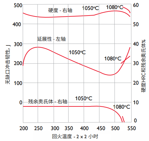 在1080°C淬火和530°C回火可获得达58HRC的硬度,仍然具有良好的延展性。