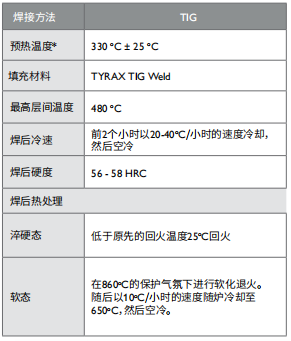 Tyrax ESR也可以在AISI420的常用硬度52HRC下使用,采用1020°C作为淬火温度并在250°C两次回火,每次回火保温2小时,残余奥氏体量<2%。